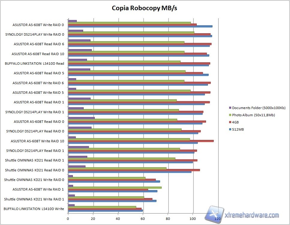 Attraverso il protocollo Robocopy abbiamo registrato 103MB/s in fase di lettura utilizzando un volume RAID1, valore che scende a 70 MB/s circa in fase di scrittura.