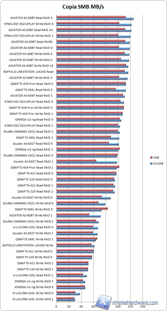 Notiamo dal grafico che il valore più alto registrato posiziona lo Shuttle KD21 a metà classifica, sotto molte soluzioni anche dual-bay come ad esempio il QNAP TS-220 o l'Asustor AS-602T, soluzioni più prestanti ma anche notevolmente più costose.